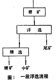 选择浮选原则流程的任务,在于解决浮选流程的段数和有用矿物的浮选顺序问题。实践中,以磨矿段数与浮选作业连系来划分浮选的段数。一般可以分为一段浮选流程和阶段磨矿阶段选别流程。将矿石一次磨到选别所需要的粒度,然后经浮选得到最终精矿的浮选流程,称为一段浮选流程(图1);